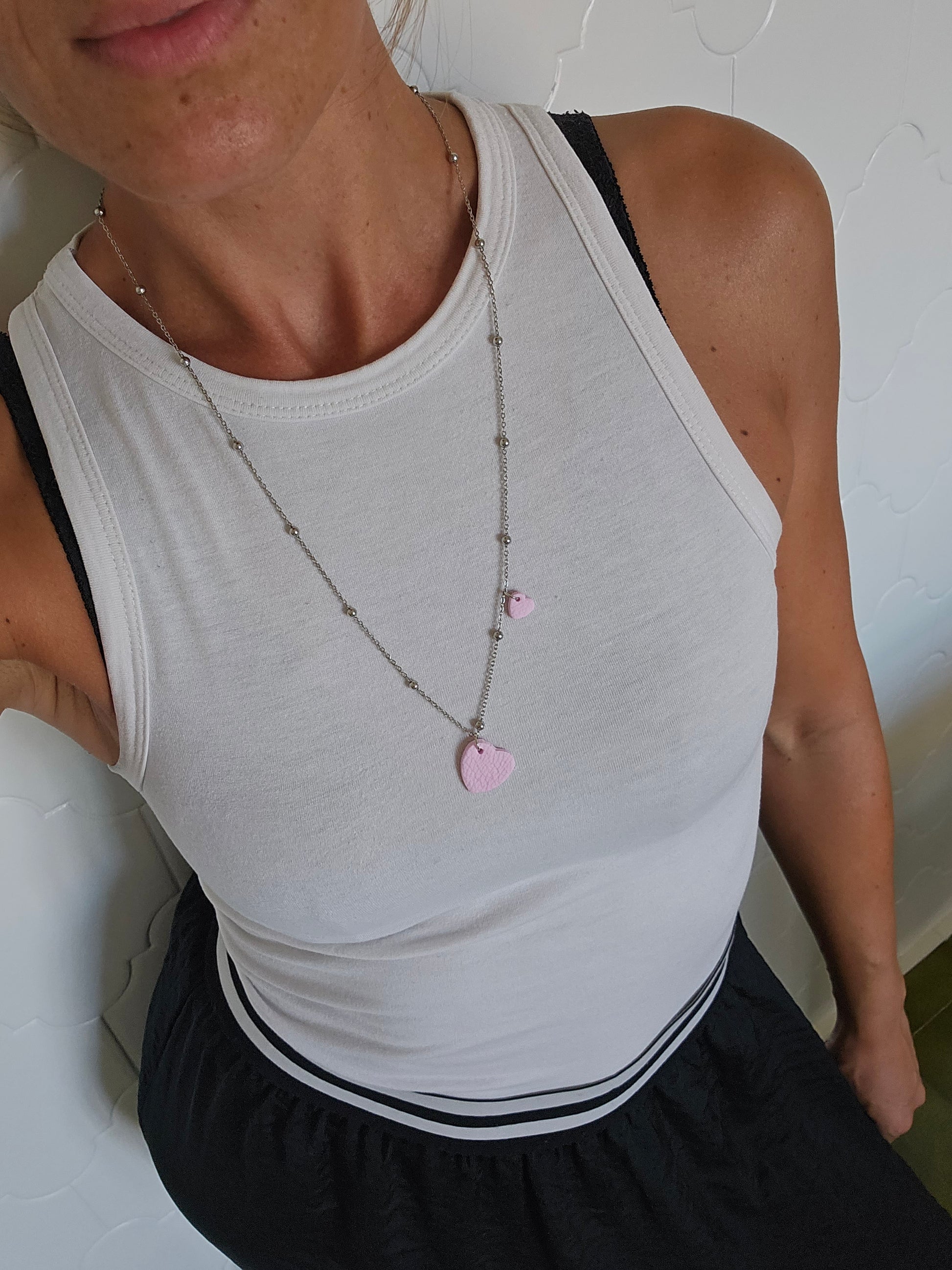 Collana in acciaio inossidabile e cuoricini in argilla polimerica fatti a mano nel laboratorio di Oltre i Desideri.